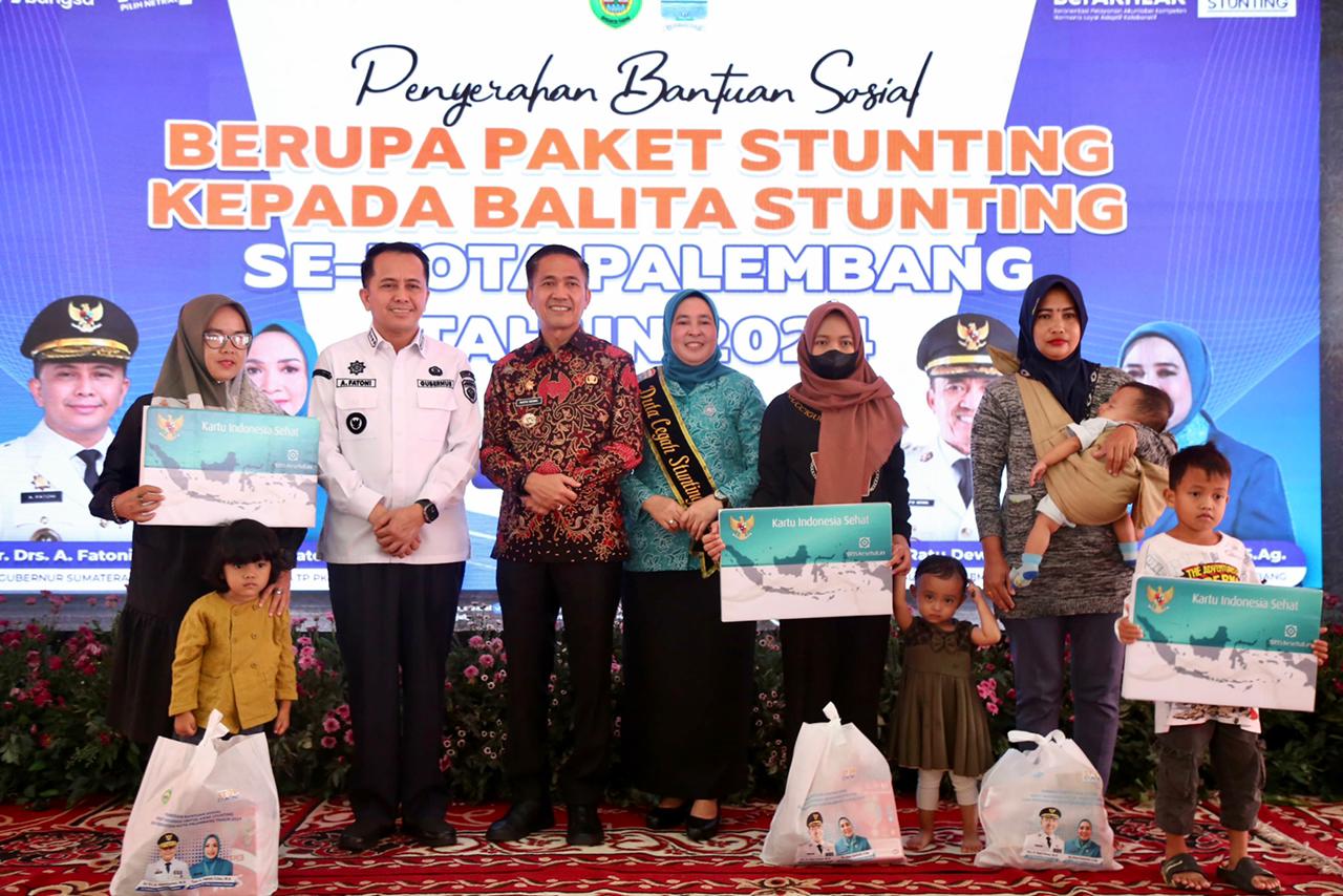 Penjabat (Pj) Gubernur Sumatera Selatan (Sumsel) Agus Fatoni bersama Pj Walikota (Walkot) Palembang Ratu Dewa membagikan bantuan sosial (bansos) yang diperuntukkan bagi anak stunting se-Kota Palembang. Penyerahan bansos dilakukan di halaman Rumah Dinas Walikota Palembang, Sumatera Selatan, Jumat (26/1/2024).