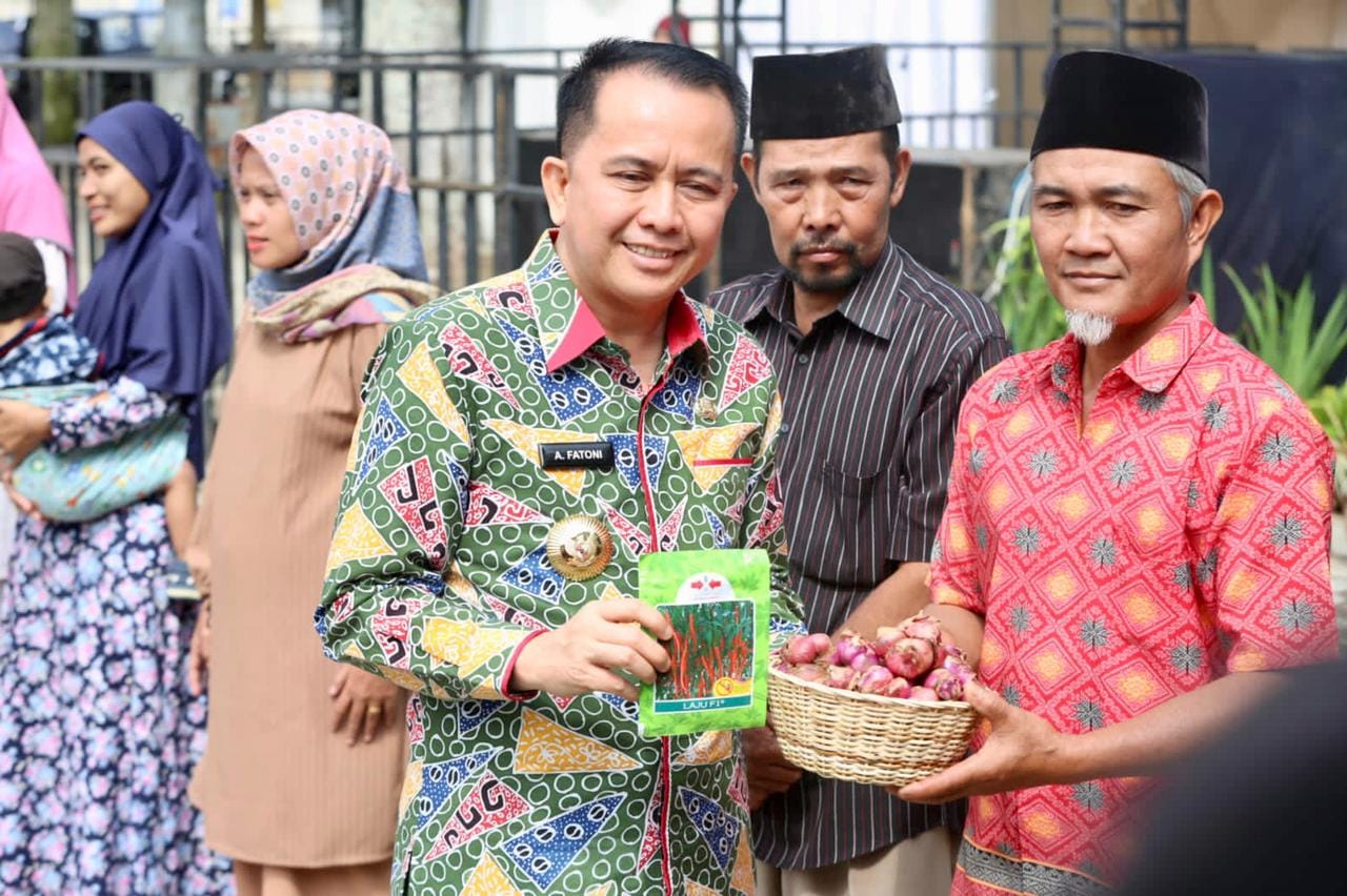 Penjabat (Pj) Gubenur Sumatera Selatan (Sumsel) Agus Fatoni dan Pj Ketua Tim Penggerak (TP) Pemberdayaan Kesejahteraan Keluarga (PKK) Tyas Fatoni membagikan bantuan bibit cabe dan bawang kepada sejumlah kelompok tani. Bantuan ini diberikan usai Launching Program Pencegahan Stunting di Kota Pagar Alam, Sumatera Selatan, Sabtu (16/12/2023).