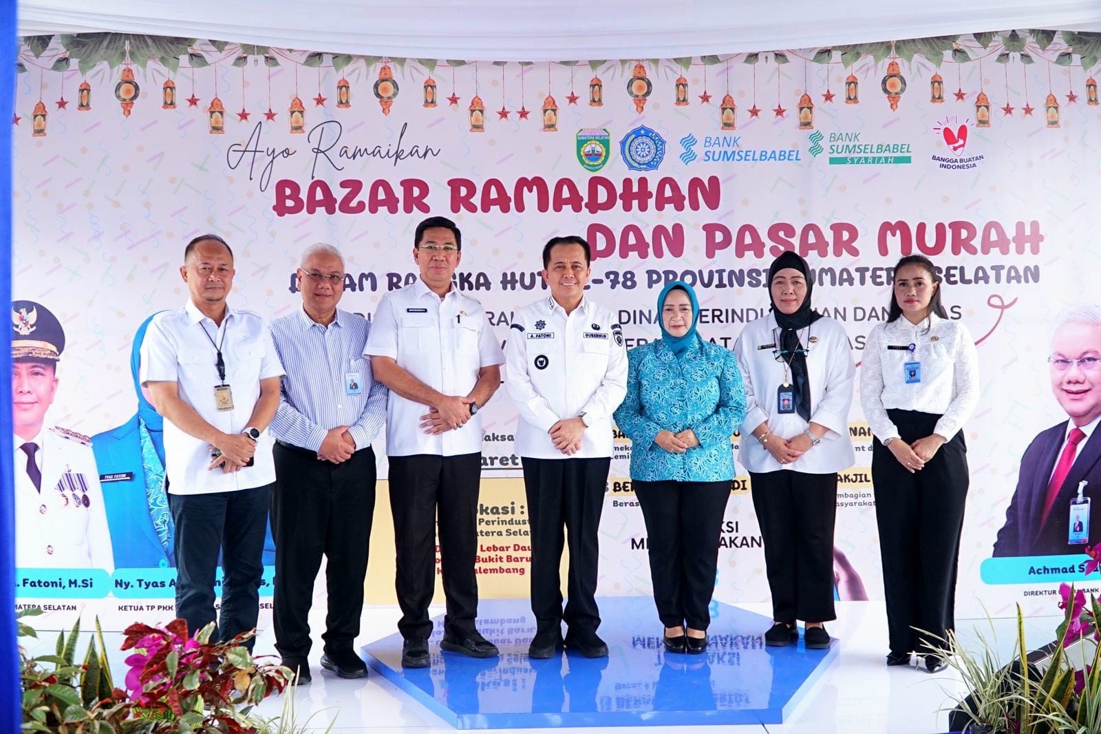 Penjabat (Pj) Gubernur Sumatera Selatan (Sumsel) Agus Fatoni bersama Pj Ketua Tim Penggerak (TP) Pemberdayaan Kesejahteraan Keluarga Provinsi Sumsel Tyas Fatoni membuka Bazar Ramadhan dan Pasar Murah dalam rangka menyambut Hari Ulang Tahun (HUT) ke-78 Provinsi Sumsel. Kegiatan ini dilaksanakan di Kantor Dinas Perindustrian Provinsi Sumsel, Palembang, Sumatera Selatan, Rabu (13/3/2024).