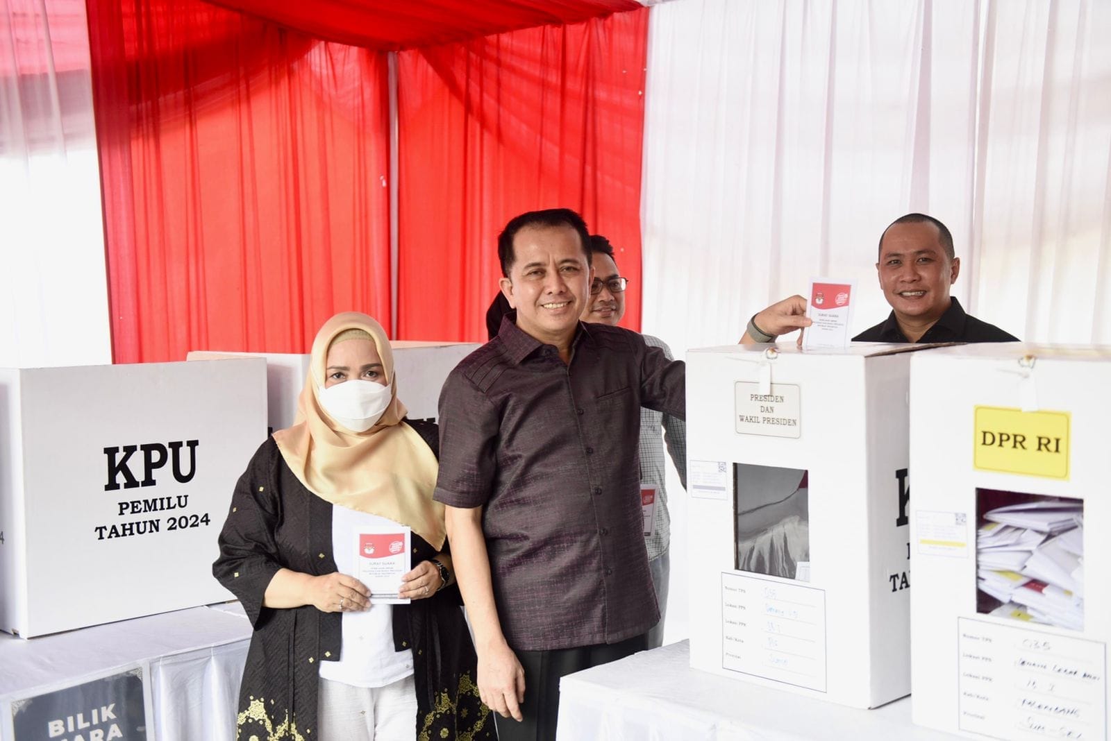 Usai melakukan pemantauan ke sejumlah titik Tempat Pemungutan Suara (TPS) di Kota Palembang, Penjabat (Pj) Gubernur Sumatera Selatan (Sumsel) didampingi Pj Ketua Tim Penggerak Pemberdayaan dan Kesejahteraan Keluarga (TP PKK) Tyas Fatoni menggunakan hak suaranya dalam Pemilihan Umum (Pemilu) 2024. Mereka menggunakan hak pilihnya di TPS 35 yang berlokasi di Jl. Lingkar Istana RT 52, RW 11 Kelurahan Demang Lebar Daun, Kecamatan Ilir Barat 1 Palembang, Rabu (14/02/2024).