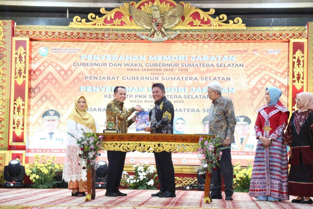 “Kita ucapkan terima kasih kepada beliau berdua yang memimpin dan membawa kemajuan Sumsel sehingga menjadi Provinsi terdepan dengan begitu banyak prestasi dan capaian,” kata Fatoni saat sambutan didampingi Pj Ketua TP PKK Sumsel Hj Tyas Fatoni dalam acara Penyerahan Memori Jabatan Gubernur Sumsel dan Wakil Gubernur Sumsel masa jabatan 2018 – 2023 kepada Pj Gubernur Sumsel dan Penyerahan Memori Jabatan Ketua TP PKK Sumsel dan Wakil Ketua TP PKK Sumsel kepada Pj Ketua TP PKK Sumsel Sumsel masa bakti 2018 – 2023, bertempat di rumah dinas Gubernur Sumsel, Griya Agung Palembang, Rabu ( 4/10/2023).