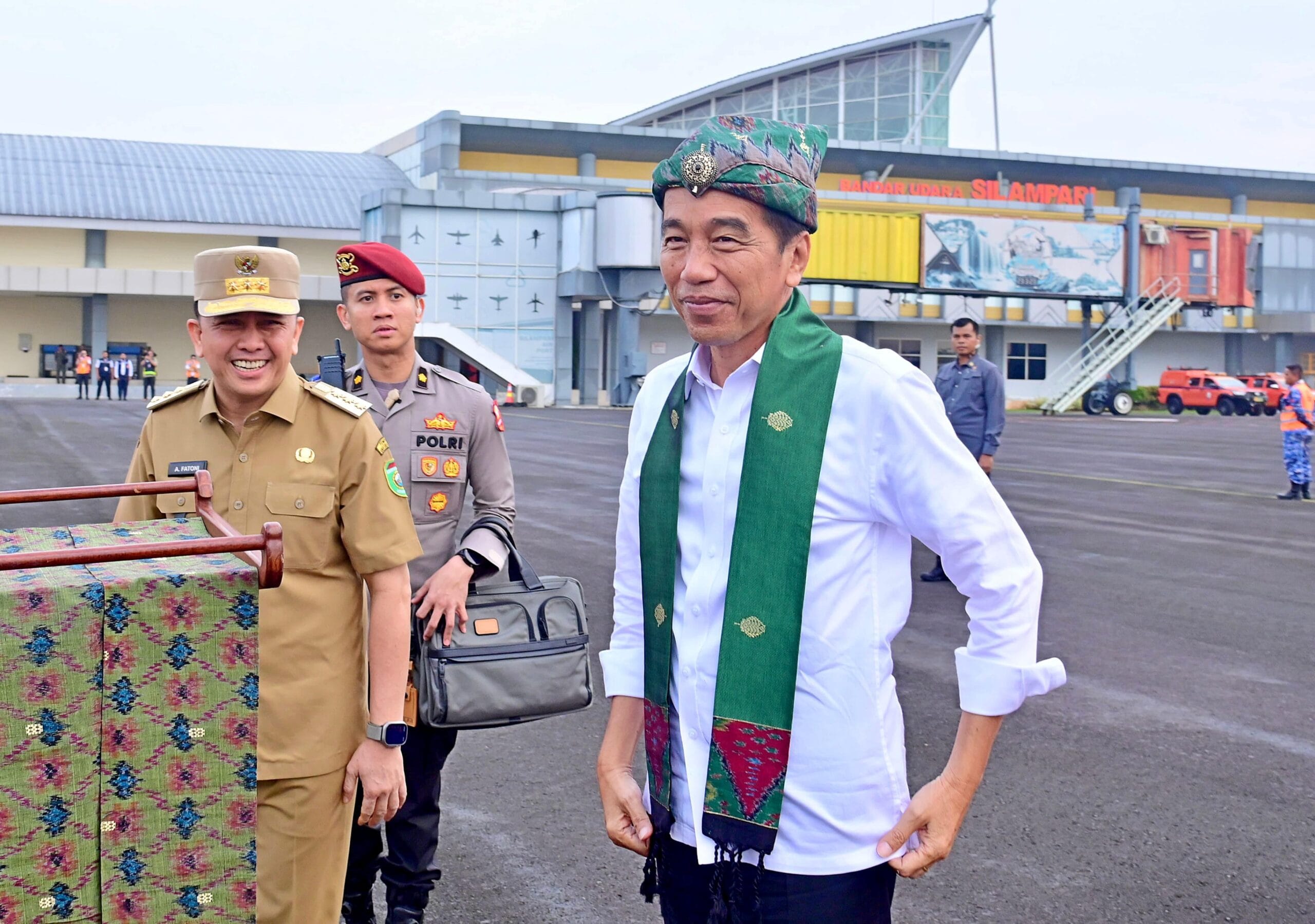 Penjabat (Pj) Gubernur Sumatera Selatan (Sumsel) Agus Fatoni menyambut kedatangan Presiden Republik Indonesia (RI) Joko Widodo (Jokowi) dalam rangka kunjungan kerja (kunker) di Sumatera Selatan. Fatoni menyambut langsung kedatangan Presiden Jokowi ketika tiba mendarat di Bandara Silampari, Lubuklinggau, Kamis (30/5/2024).