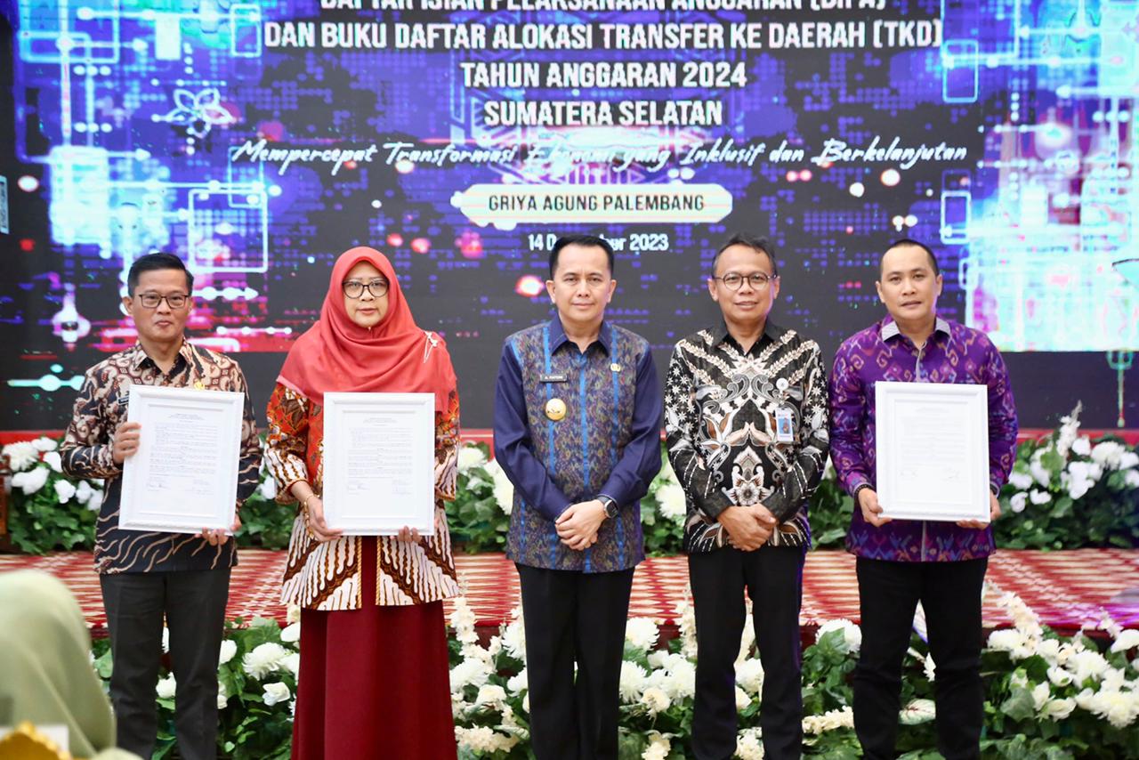 Pada tahun anggaran 2024, Provinsi Sumsel mendapatkan alokasi pagu anggaran sebesar Rp51,24 triliun, atau naik sebesar 10,31% jika dibandingkan dengan alokasi di tahun 2023. Alokasi tersebut terbagi sebesar Rp19,58 triliun untuk alokasi DIPA Satuan Kerja Pemerintah Pusat (SKPD) di wilayah Sumsel dan Rp31,66 triliun untuk alokasi TKD untuk Pemerintah Daerah di wilayah Sumsel.