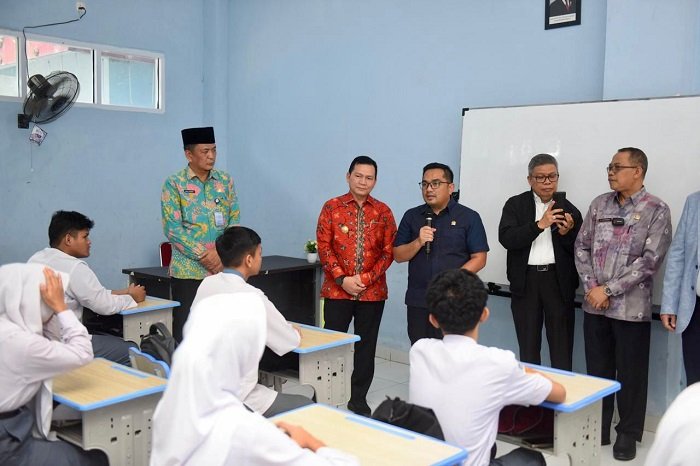 Penjabat (Pj) Gubernur Sumatera Selatan (Sumsel) Elen Setiadi, S.H., M.S.E mendampingi Ketua Komisi II DPR RI, M. Rifqinizamy Karsayuda beserta rombongan tim meninjau simulasi Makan Bergizi Gratis (MBG) di SMK Negeri 2 Palembang, Jumat (13/12/2024).