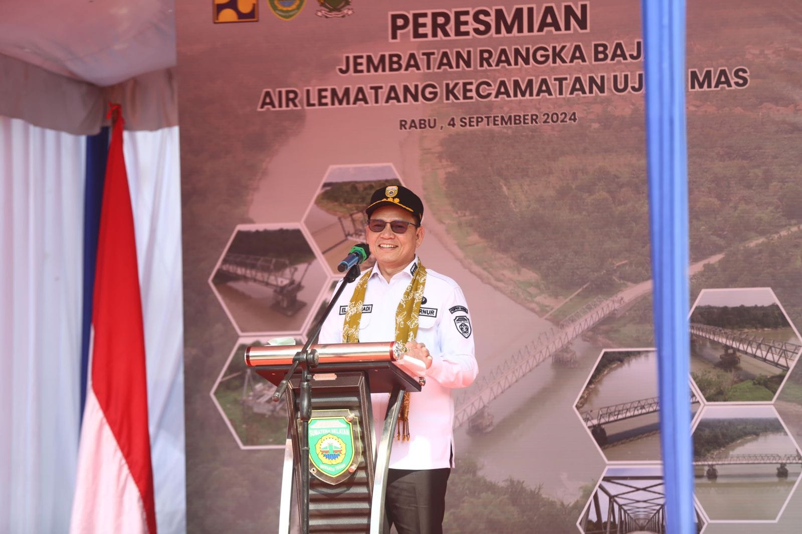 Penjabat (Pj) Gubernur Provinsi Sumatera Selatan (Sumsel) Elen Setiadi, S.H, M. S.E, didampingi Pj Bupati Muara Enim, H. Henky Putrawan, S.Pt., M.Si., M.M meresmikan jembatan rangka baja Air Lematang Desa Ujan Mas Lama Kabupaten Muara Enim,Rabu (4/9/2024) pagi.