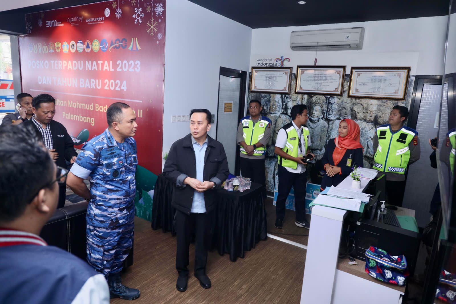 Penjabat (Pj) Gubernur Sumatera Selatan (Sumsel) Agus Fatoni meninjau sejumlah pokos keamanan Natal dan Tahun Baru 2024. Salah satunya yang berlokasi di Bandara Sultan Mahmud Badaruddin II Palembang, Sumatera Selatan, Minggu (31/12/2023).