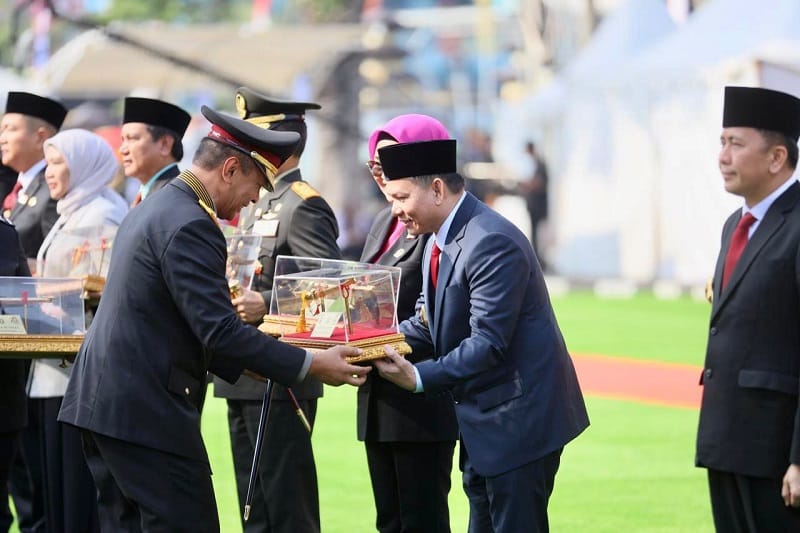 Kepala Kepolisian Republik Indonesia (Kapolri) Jenderal Polisi Drs. Listyo Sigit Prabowo, M.Si memberikan penghargaan kepada Penjabat (Pj) Gubernur Sumatera Selatan (Sumsel) Elen Setiadi, S.H, M.S.E yang diserahkan oleh Kapolda Sumsel, Irjen Pol, A. Rachmad Wibowo,SIK kepada Pj Gubernur Elen Setiadi saat menghadiri upacara dan syukuran Peringatan Hari Bhayangkara ke 78 di Halaman Mapolda Sumsel, Jalan Jend. Sudirman Km. 4,5 Palembang, Senin (1/7/2024).