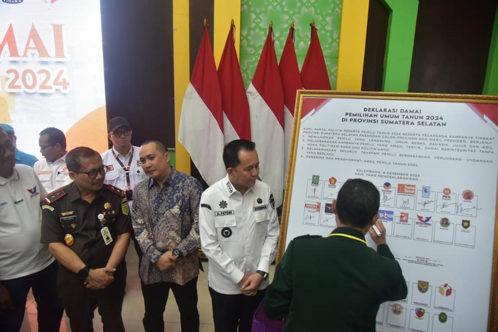Penjabat (Pj) Gubernur Sumatera Selatan (Sumsel) Agus Fatoni memimpin kegiatan ‘Deklarasi Damai Pemilihan Umum Tahun 2024’ bersama Forum Koordinasi Pimpinan Daerah (Forkopimda), Bupati/Walikota, sejumlah anggota partai politik (parpol) dan tim pemenangan Calon Presiden (Capres)/Calon Wakil Presiden (Cawapres) nomor urut 1, 2 dan 3. Kegiatan ini dilaksanakan di Asrama Haji Palembang, Sumatera Selatan, Jumat (8/12/2023).