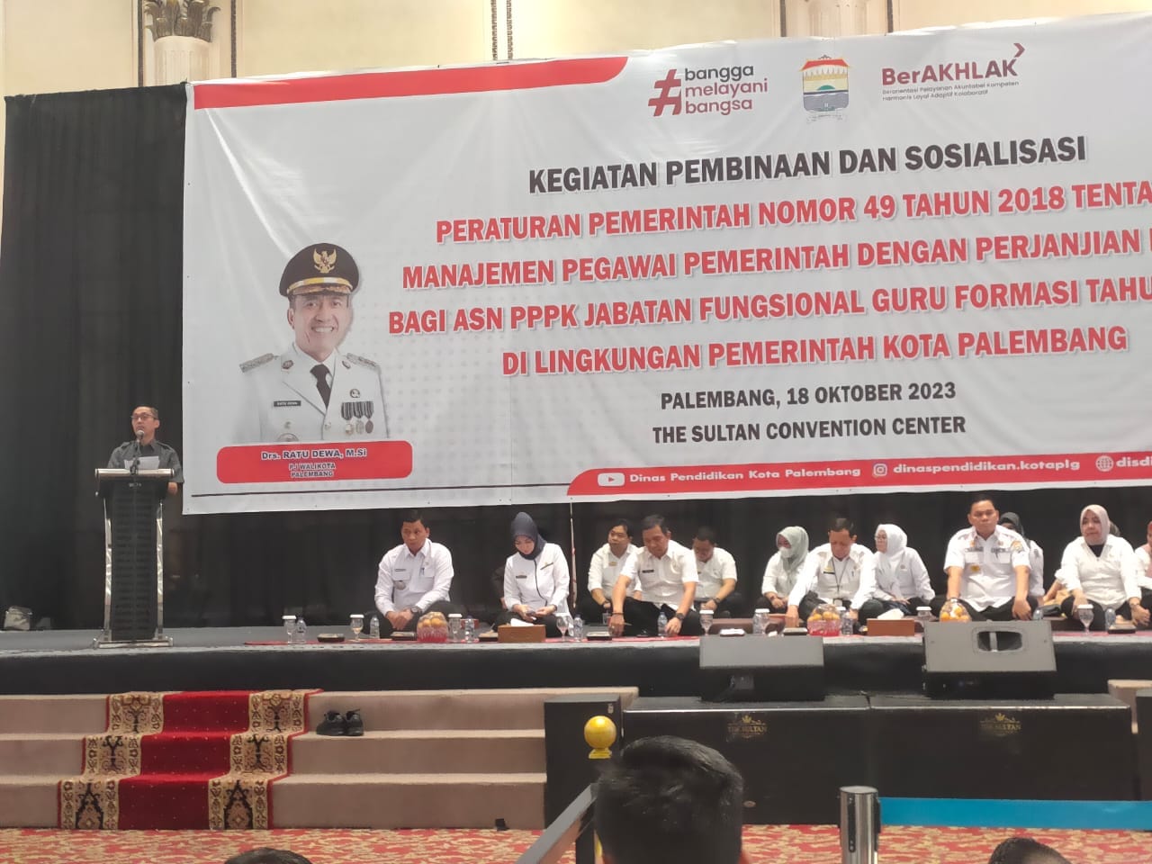 Pj Walikota Palembang, Ratu Dewa menghadiri undangan dari Kepala Dinas Pendidikan Kota Palembang dalam rangka pembinaan dan sosialisasi terhadap 2.577 Aparatur Sipil Negara (ASN) Pegawai Pemerintah dengan Perjanjian Kerja (PPPK) di Kota Palembang, Rabu (18/10/2023)