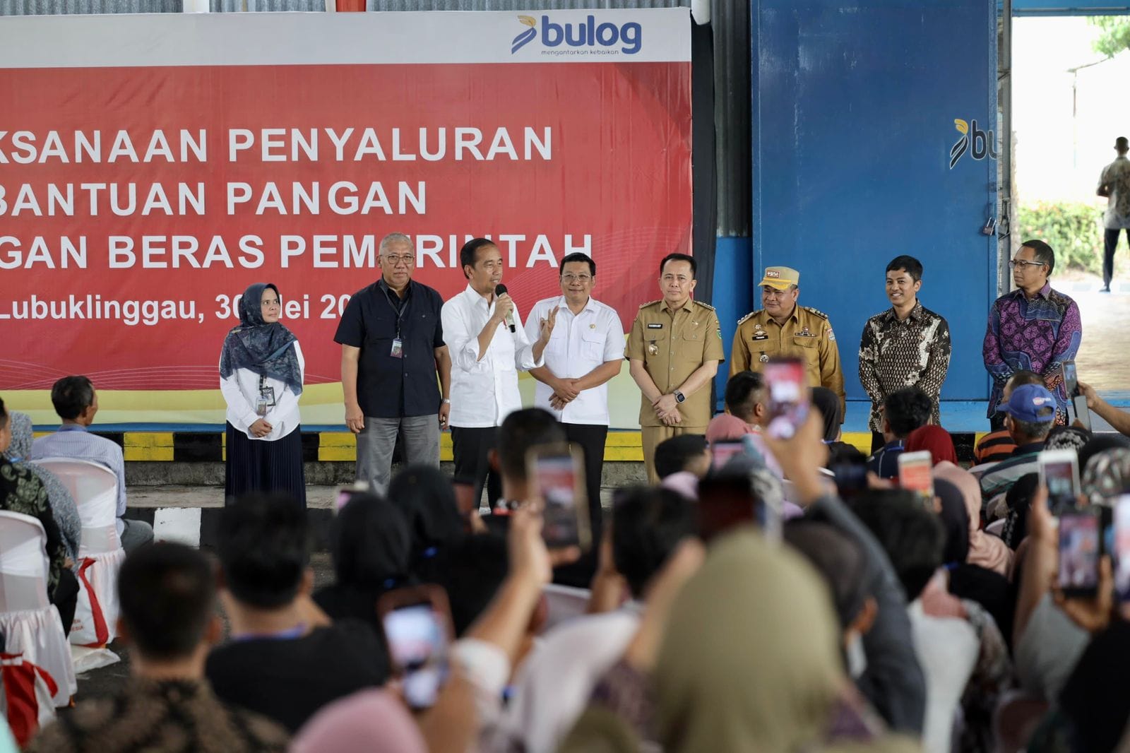 Presiden Republik Indonesia (RI) Joko Widodo bersama Penjabat (Pj) Gubernur Sumatera Selatan (Sumsel) Agus Fatoni menyerahkan bantuan pangan cadangan beras pemerintah kepada keluarga penerima manfaat. Bantuan ini diserahkan di sela-sela kegiatan kunjungan kerja (kunker) Presiden Jokowi di Gudang Bulog Kota Lubuklinggau, Sumatera Selatan, Kamis (30/5/2024).