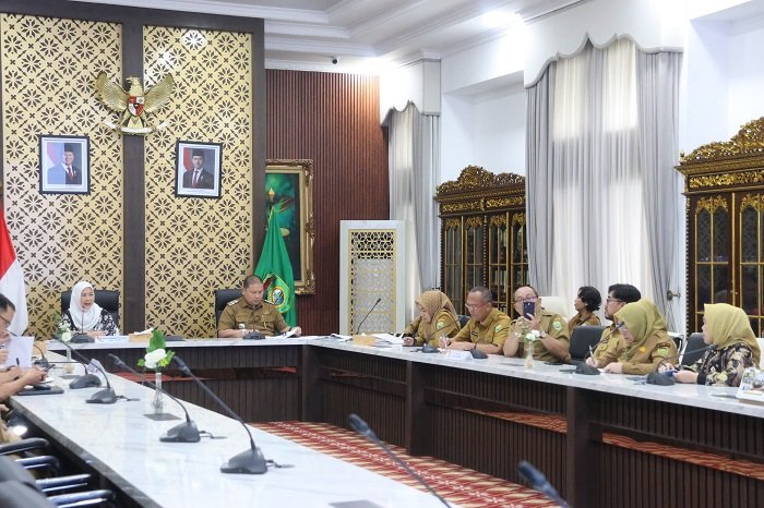 Ketua Tim Pembina Pos Pelayanan Terpadu (Posyandu) Hj Febrita Lustia Herman Deru memimpin langsung rapat terbatas terkait dengan rencana pembentukan pengurus pembina Posyandu tingkat Provinsi Sumatera Selatan (Sumsel) bertempat di ruang rapat Griya Agung Palembang, Selasa (11/3/2025) siang.