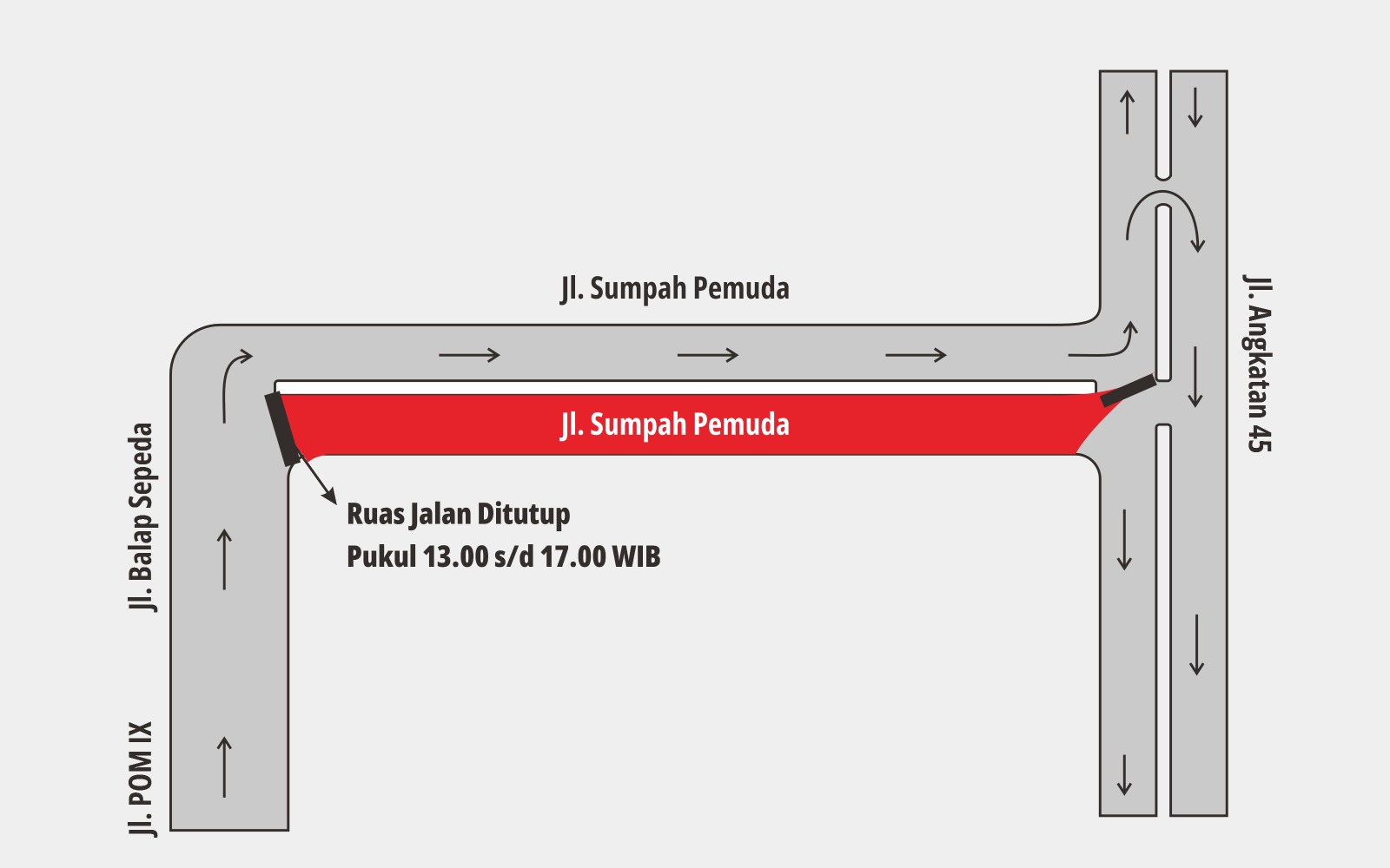 Penutupan akan dilakukan mulai pukul 13.00 hingga 17.00 WIB. Pengendara dari arah Jalan Balap Sepeda menuju Jalan Sumpah Pemuda akan diarahkan melalui jalur sebelah kiri, sementara ruas sebelah kanan ditutup sementara.