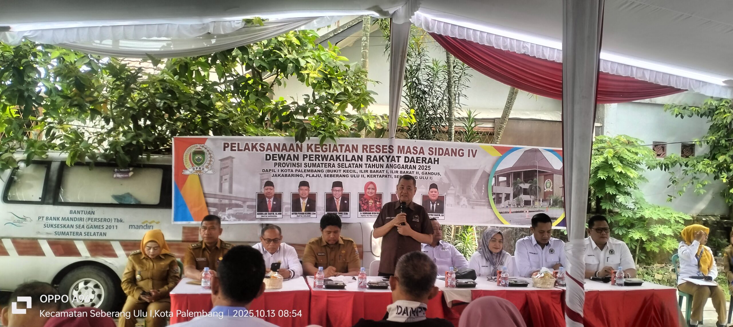 Anggota Dewan Perwakilan Rakyat Daerah (DPRD) Provinsi Sumatera Selatan (Sumsel) dari Daerah Pemilihan (Dapil) I Kota Palembang menggelar kegiatan Reses Masa Sidang IV Tahun Anggaran 2025, yang mencakup wilayah Kecamatan Bukit Kecil, Ilir Barat I, Ilir Barat II, Gandus, Jakabaring, Plaju, Seberang Ulu I, Seberang Ulu II dan Kertapati.