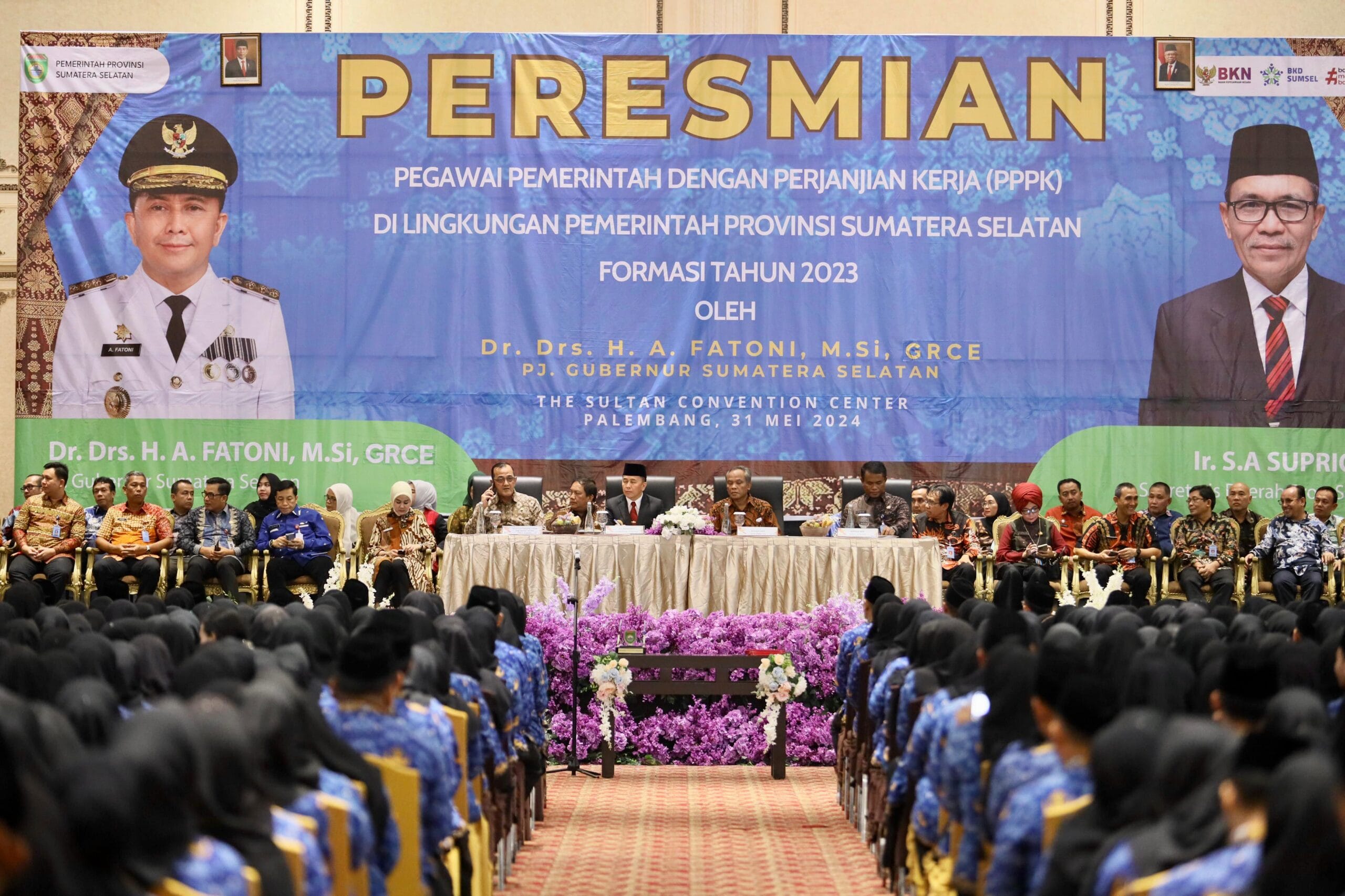 Penjabat (Pj) Gubernur Sumatera Selatan (Sumsel) Agus Fatoni meresmikan sekaligus mengukuhkan 1.345 Pegawai Pemerintah dengan Perjanjian Kerja (PPPK) di Lingkungan Provinsi Sumsel Formasi Tahun 2023. Kegiatan ini berlangsung di The Sultan Convention Center Palembang, Sumatera Selatan, Jumat (31/5/2024).