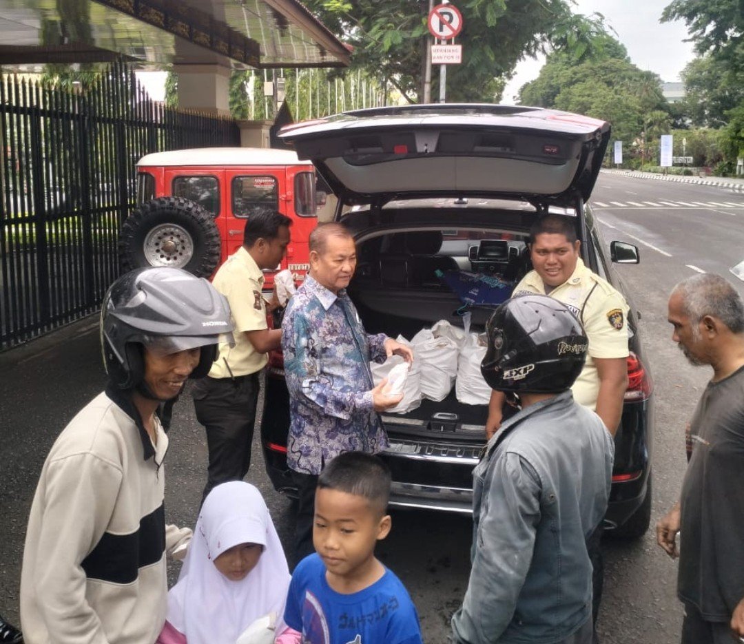SEDEKAH—Chairul S Matdiah membagikan nasi bungkus gratis, Minggu (21/12/2025). (FOTO: IST).