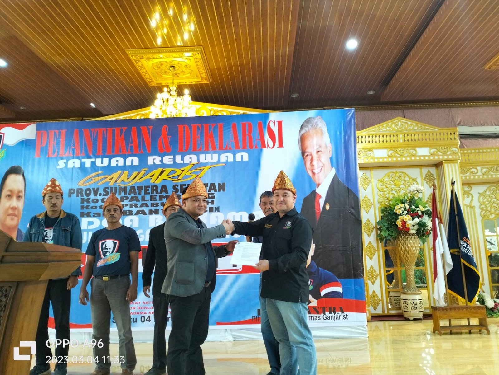Pelantikan dan Deklarasi Satuan Relawan Ganjarist Provinsi Sumsel dan doa bersama untuk Ganjar Pranowo menuju Presiden Indonesia digelar di Graha Bandara Insani, Sabtu (4/3/2023).