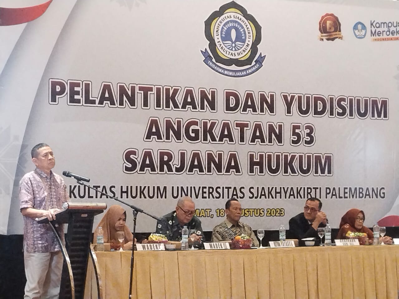 “Kegiatan Yudisium dapat menjadi indikator bahwa saudara-saudara para mahasiswa/mahasiswi Fakultas Hukum Universitas Sjakhyakirti Palembang telah menyelesaikan pendidikan jenjang Strata Satu (S1) dan berhak menyandang gelar Sarjana Hukum (SH),” imbuhnya.