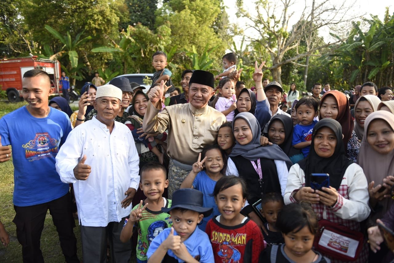 Antusias masyarakat Kecamatan Gelumbang Kabupaten Muara Enim begitu luar biasa menyambut kehadiran Gubernur Sumsel H Herman Deru bersama Ketua TP PKK Sumsel, Hj Febrita Lustia HD saat memberikan santunan bagi Anak Yatim dan Dhuafa dalam rangka memperingati Tahun Baru Islam 1445 H di Masjid Jami Babussalam Gelumbang Kabupaten Muara Ebim, Sabtu (29/7) petang.