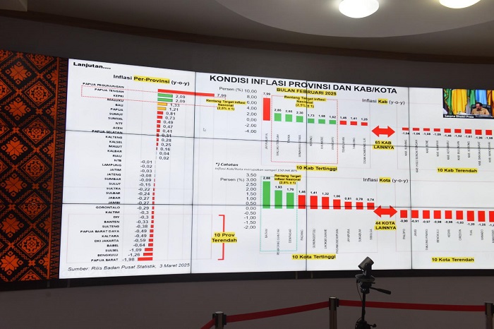 Selanjutnya, Tito juga menyampaikan Tren tingkat inflasi Indonesia berdasarkan perkembangan inflasi nasional per februari 2025, yaitu Inflasi y on y, Indonesia pada bulan Februari 2025 terhadap Februari 2024 yaitu -0,09% ,dengan m tp m -0,4%.
