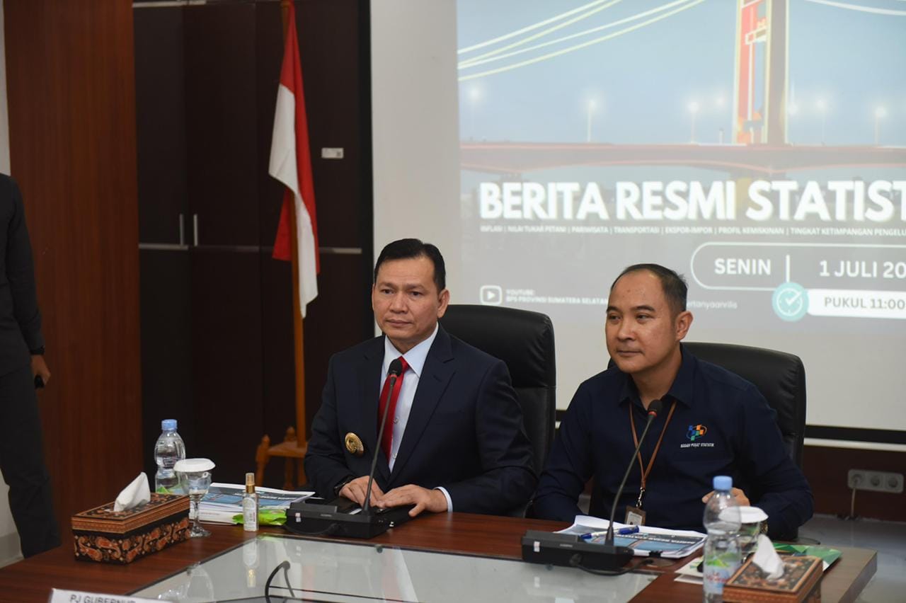 Penjabat (Pj) Gubernur Sumatera Selatan (Sumsel) Elen Setiadi menghadiri kegiatan Rilis Berita Resmi Statistik (BRS) Badan Pusat Statistik (BPS) Provinsi Sumsel di Ruang Vicon Lantai 1 BPS Provinsi Sumsel, Senin (1/7/2024) siang.