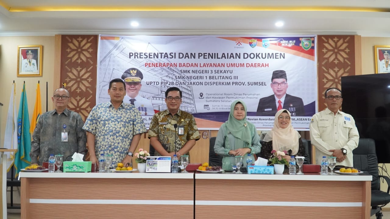 Dinas Perumahan Rakyat dan kawasan Permukiman (Disperkim) Provinsi Sumatera Selatan (Sumsel) hari ini melaksanakan presentasi dan penilaian dokumen untuk penerapan Badan Layanan Umum Daerah (BLUD) dalam hal ini Unit Pelaksana Teknis Dinas (UPTD) Pusat Informasi Pengembangan Permukiman, Bangunan dan Jasa Konstruksi (PIP2B) dan Jasa Konstruksi (Jakon) yang langsung dihadiri Pelaksana Tugas (Plt) Kepala Disperkim Provinsi Sumsel Ir H Novian Aswardani, S.T.,M.M.,IPM.,ASEAN.Eng bertempat di Operation Room Disperkim Provinsi Sumsel, Jumat (13/10/2023).