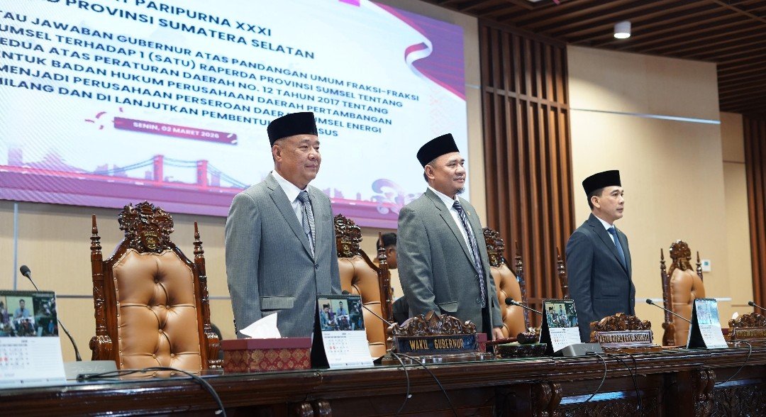 Wakil Gubernur Sumatera Selatan (Sumsel) H. Cik Ujang menghadiri Rapat Paripurna XXI (31) DPRD Provinsi Sumsel dengan agenda penyampaian tanggapan atau jawaban Gubernur atas pandangan umum fraksi-fraksi DPRD terhadap Rancangan Peraturan Daerah (Ranperda) tentang Perubahan Kedua atas Peraturan Daerah Nomor 12 Tahun 2017 tentang Perubahan Bentuk Badan Hukum Perusahaan Daerah Pertambangan dan Energi menjadi Perusahaan Perseroan Daerah PT Sumsel Energi Gemilang. Rapat tersebut dilanjutkan dengan pembentukan panitia khusus (pansus) di Ruang Rapat DPRD Sumsel, Senin (2/3/2026).